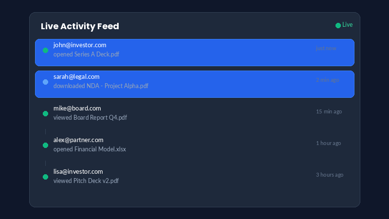 Watch in real-time as recipients view your documents. Track exactly who accessed what and when.