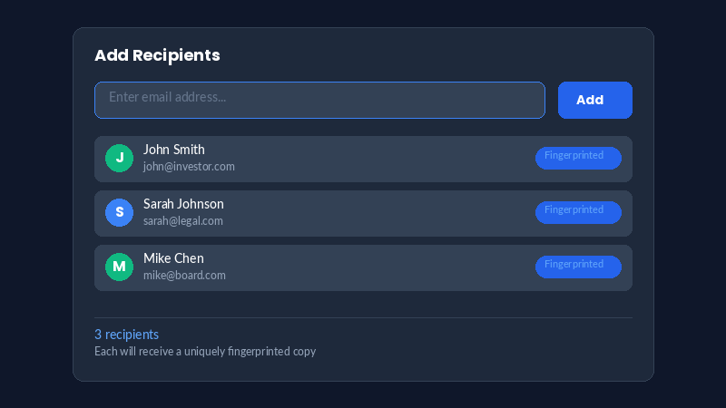 If you suspect a leak, upload the leaked document to instantly identify which recipient it came from.