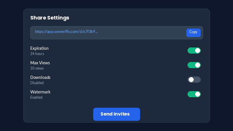 Generate unique, tracked sharing links for each recipient. You control every aspect of access.