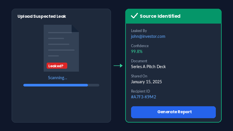 What Happens: Our system scans the leaked document for embedded fingerprints. Within seconds, you know exactly which recipient's copy was leaked.